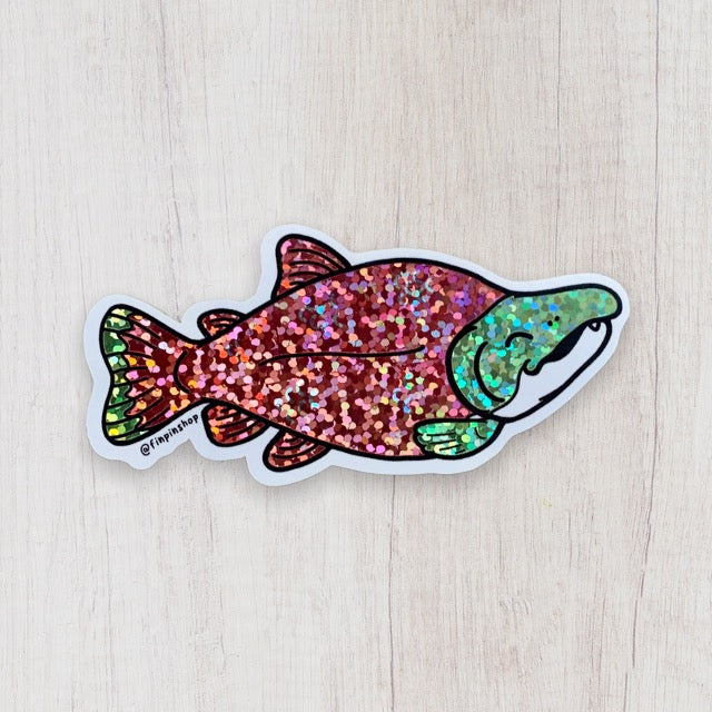 Shiny sockeye salmon sticker for August 2022 Patreon. This sticker measures 3" x 1.5" and has a glitter effect on it.