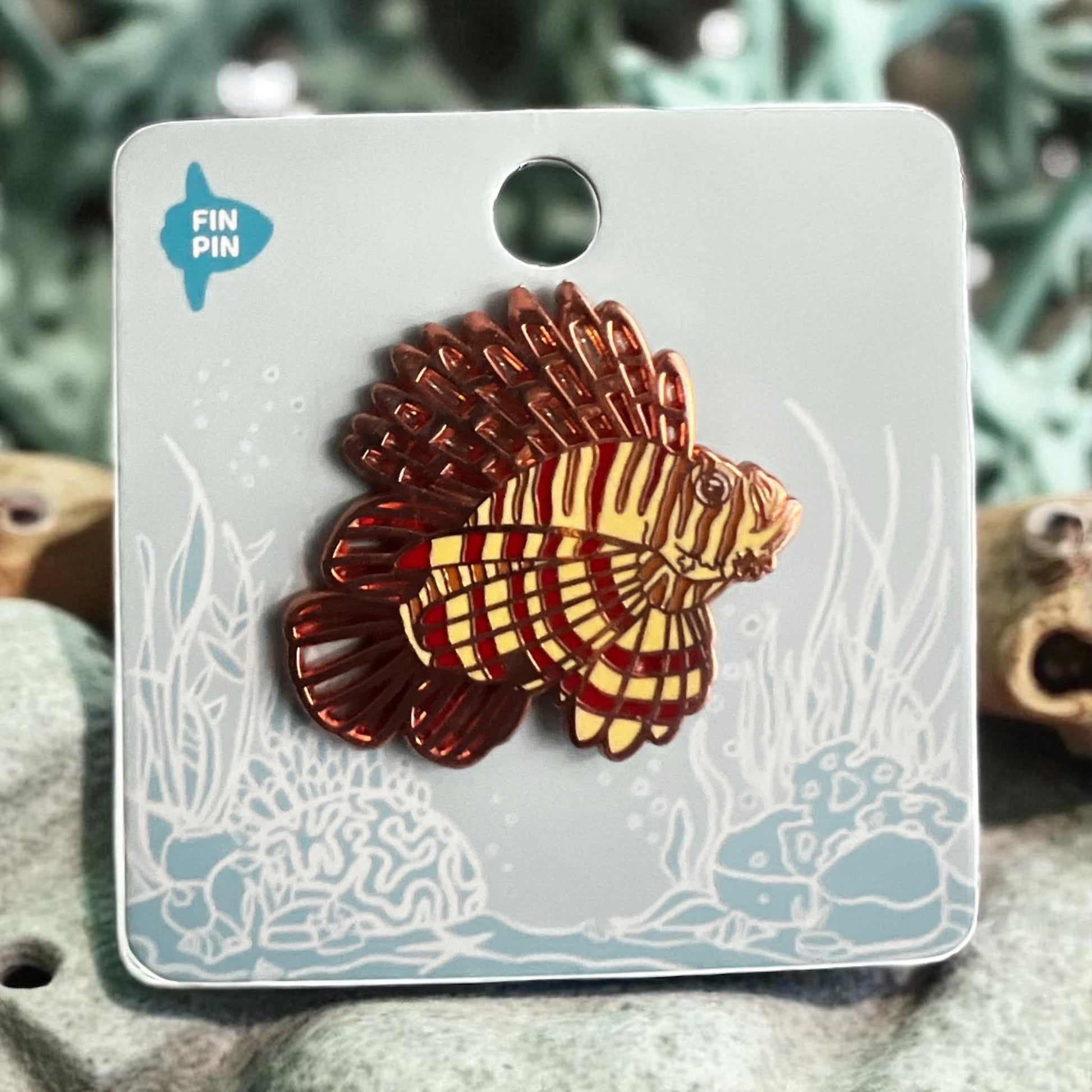Meet our lionfish (Pterois volitans) pin ❤️ Use this cute little predatory reef fish to start a dialogue about invasive species! This species of lionfish is native to the Indo-Pacific region but was introduced to the U.S. Atlantic coastal waters, where they threaten native fish and the environment.