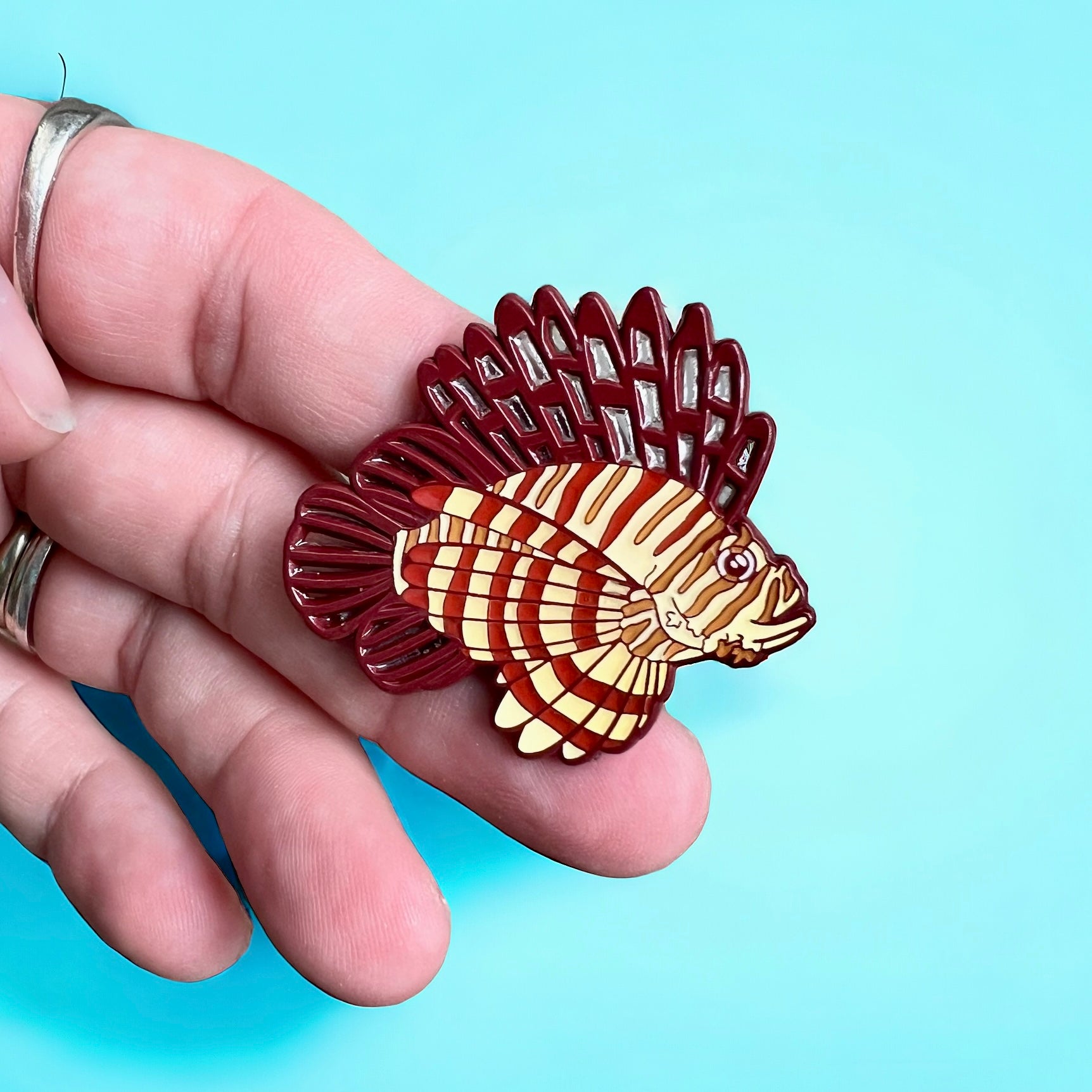 Meet our lionfish (Pterois volitans) pin ❤️ Use this cute little predatory reef fish to start a dialogue about invasive species! This species of lionfish is native to the Indo-Pacific region but was introduced to the U.S. Atlantic coastal waters, where they threaten native fish and the environment.